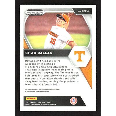 This is a 2021 Panini Prizm Draft Picks Chad Dallas baseball card. The card is #PDP121 and pictures show condition.