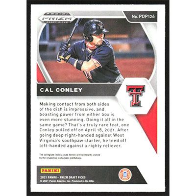 This is a 2021 Panini Prizm Draft Picks Cal Conley baseball card. The card is #PDP126 and pictures show condition.