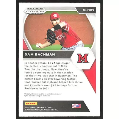 This is a 2021 Panini Prizm Draft Picks Sam Bachman baseball card. The card is #PDP9 and pictures show condition.
