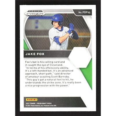 This is a 2021 Panini Prizm Draft Picks Jake Fox baseball card. The card is #PDP95 and pictures show condition.