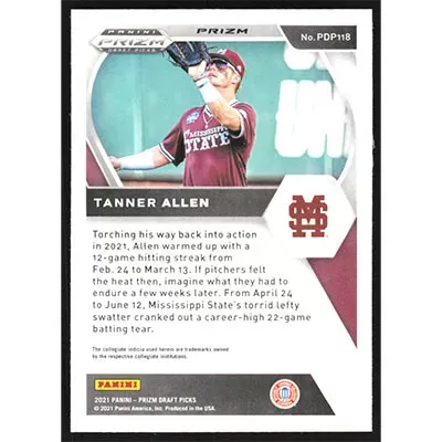 This is a 2021 Panini Prizm Draft Picks Red Velocity Tanner Allen baseball card. The card is #PDP118 and pictures show condition. Team(s): Mississippi State Bulldogs
