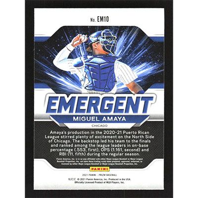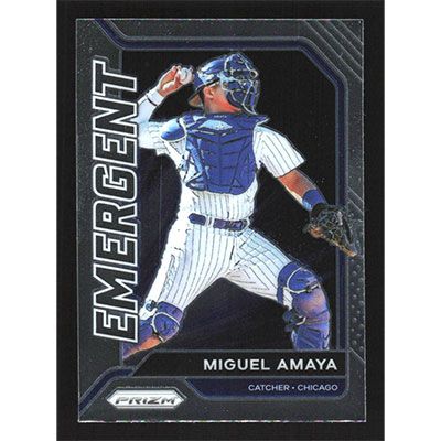 This is a 2021 Panini Prizm Emergent Miguel Amaya baseball card. The card is #EM10 and pictures show condition.