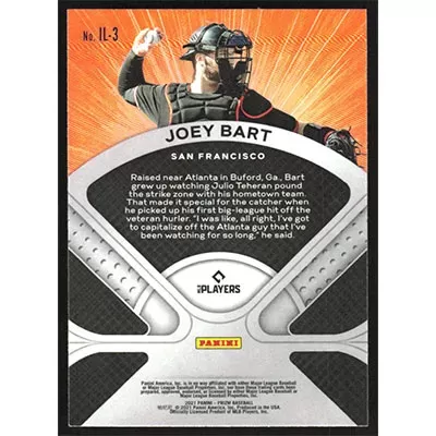 This is a 2021 Panini Prizm Illumination Joey Bart baseball card. The card is #IL-3 and pictures show condition.