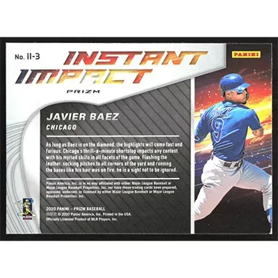 This is a 2021 Panini Prizm Instant Impact Red White and Blue Javier Baez baseball card. The card is #II-3 and pictures show condition. Team(s): Chicago Cubs