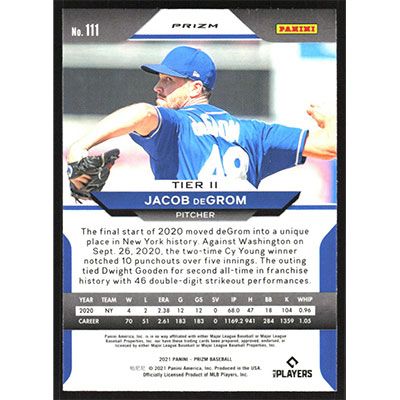 This is a 2021 Panini Prizm Purple Jacob deGrom baseball card. The card is #111 and pictures show condition.