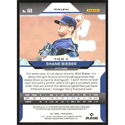 This is a 2021 Panini Prizm Purple Shane Bieber baseball card. The card is #166 and pictures show condition.