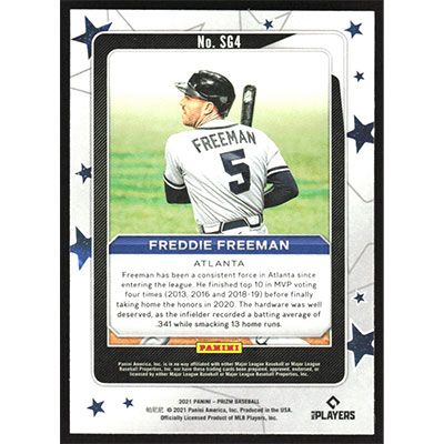 This is a 2021 Panini Prizm Star Gazing Freddie Freeman baseball card. The card is #SG4 and pictures show condition.