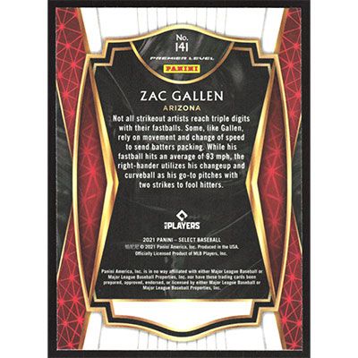 This is a 2021 Panini Select Zac Gallen Premier baseball card. The card is #141 and pictures show condition.