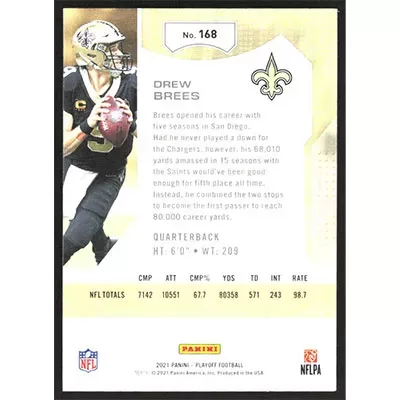 This is a 2021 Playoff Drew Brees football card. The card is #168 and pictures show condition.