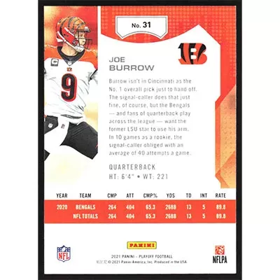 This is a 2021 Playoff Joe Burrow football card. The card is #31 and pictures show condition.