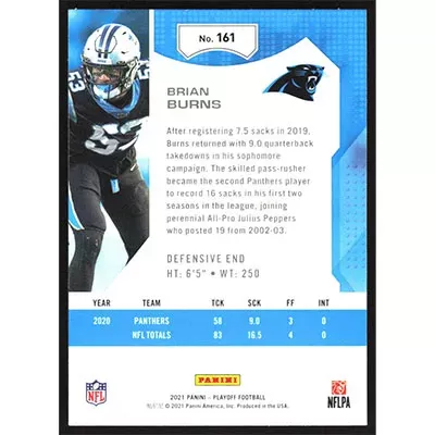 This is a 2021 Playoff Goal Line Brian Burns football card. The card is #161 and pictures show condition.