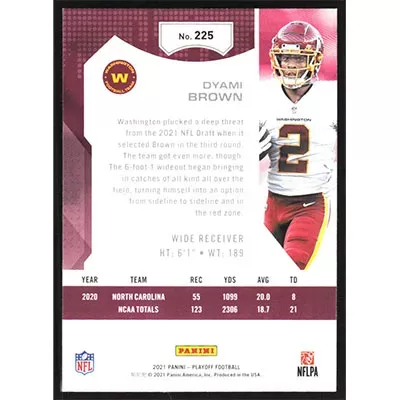 This is a 2021 Playoff Goal Line Dyami Brown football card. The card is #225 and pictures show condition. Team(s): Washington Football Team Rookie Card (RC)