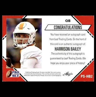 This is a 2021 Pro Set College Autographs Harrison Bailey football card. This card features an autograph of Harrison Bailey, and is certified authentic by Leaf. The card is #PS-HB2 and is in NM-MT condition.
