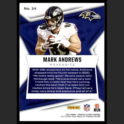 This is a 2021 Rookies & Stars Mark Andrews football card. The card is #14 and is in NM-MT condition.