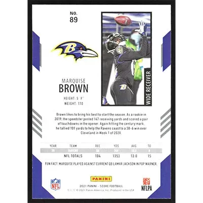 This is a 2021 Score Marquise Brown football card. The card is #89 and pictures show condition.
