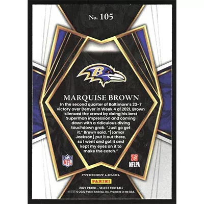 This is a 2021 Select Marquise Brown football card. The card is #105 and pictures show condition.