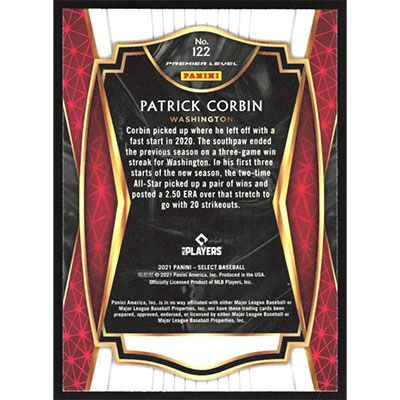 This is a 2021 Select Patrick Corbin Premier baseball card. The card is #122 and pictures show condition.