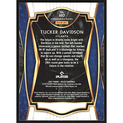 This is a 2021 Select Tucker Davidson Premier baseball card. The card is #160 and pictures show condition.