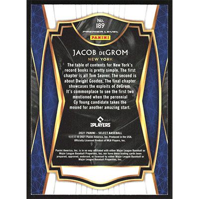 This is a 2021 Select Jacob deGrom Premier baseball card. The card is #189 and pictures show condition.