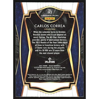 This is a 2021 Select Carlos Correa Premier baseball card. The card is #193 and pictures show condition.