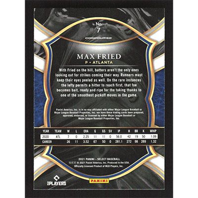 This is a 2021 Select Max Fried baseball card. The card is #7 and pictures show condition.