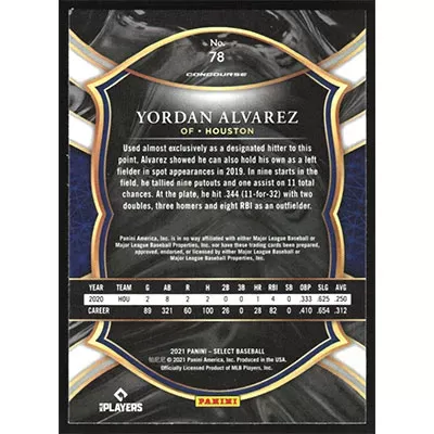 This is a 2021 Select Yordan Alvarez baseball card. The card is #78 and pictures show condition.