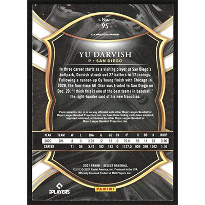 This is a 2021 Select Yu Darvish baseball card. The card is #95 and pictures show condition.