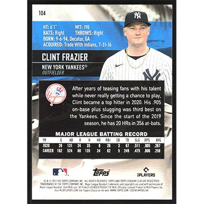 This is a 2021 Stadium Club Clint Frazier baseball card. The card is #104 and pictures show condition.