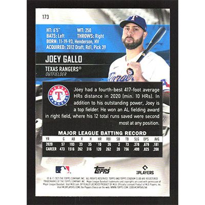 This is a 2021 Stadium Club Joey Gallo baseball card. The card is #173 and pictures show condition.