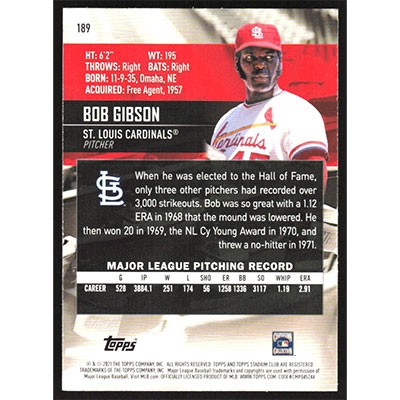 This is a 2021 Stadium Club Bob Gibson baseball card. The card is #189 and pictures show condition.