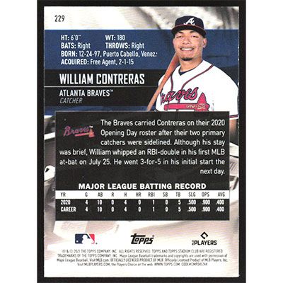 This is a 2021 Stadium Club William Contreras baseball card. The card is #229 and pictures show condition.