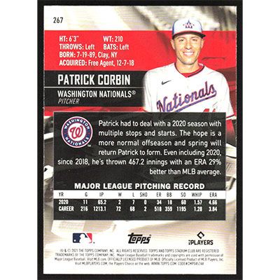 This is a 2021 Stadium Club Patrick Corbin baseball card. The card is #267 and pictures show condition.