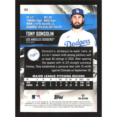This is a 2021 Stadium Club Tony Gonsolin baseball card. The card is #283 and pictures show condition.
