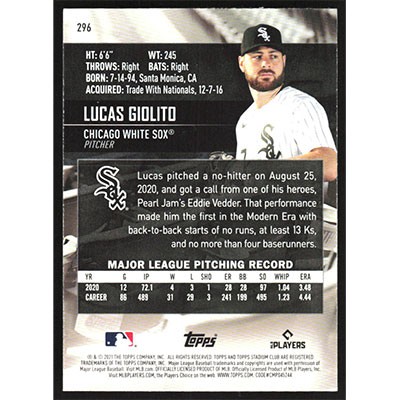 This is a 2021 Stadium Club Lucas Giolito baseball card. The card is #296 and pictures show condition.