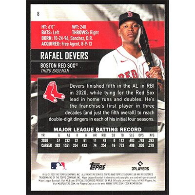 This is a 2021 Stadium Club Rafael Devers baseball card. The card is #8 and pictures show condition.