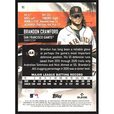 This is a 2021 Stadium Club Brandon Crawford baseball card. The card is #91 and pictures show condition.