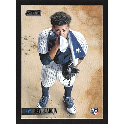 This is a 2021 Stadium Club Black Foil Deivi Garcia baseball card. The card is #140 and pictures show condition. Team(s): New York Yankees Rookie Card (RC)