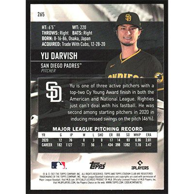 This is a 2021 Stadium Club Chrome Yu Darvish baseball card. The card is #265 and pictures show condition.