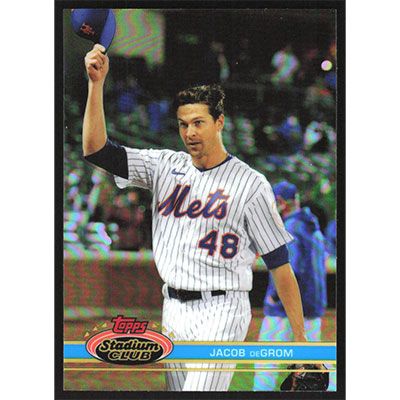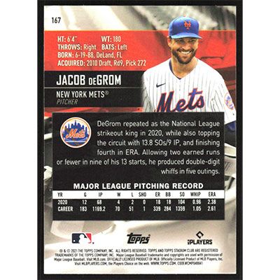 This is a 2021 Stadium Club Chrome '91 Design Variations Jacob deGrom baseball card. The card is #167 and pictures show condition. Team(s): New York Mets