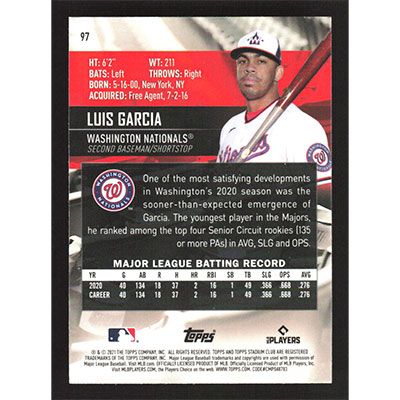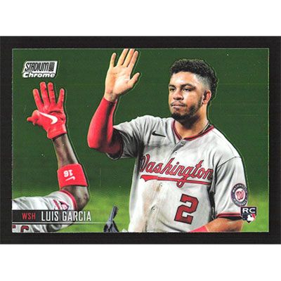 This is a 2021 Stadium Club Chrome Luis Garcia baseball card. The card is #97 and pictures show condition. Team(s): Washington Nationals Rookie Card (RC)