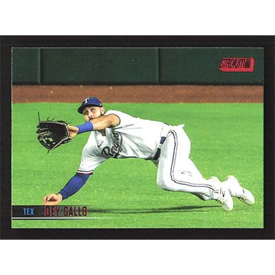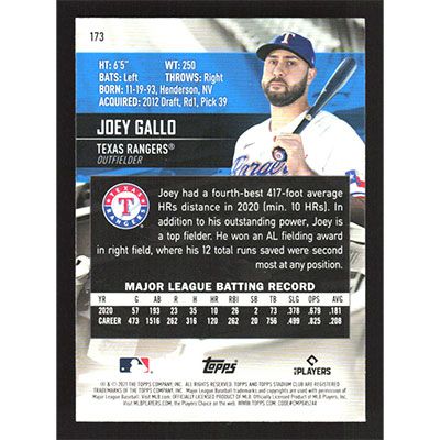 This is a 2021 Stadium Club Red Foil Joey Gallo baseball card. The card is #173 and pictures show condition.