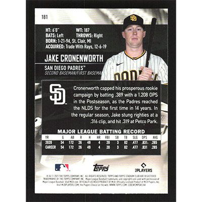 This is a 2021 Stadium Club Red Foil Jake Cronenworth baseball card. The card is #181 and pictures show condition. Team(s): San Diego Padres Rookie Card (RC)