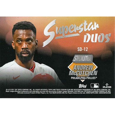 This is a 2021 Stadium Club Superstar Duos Bryce Harper and Andrew McCutchen baseball card. The card is #SD-12 and is in NM-MT condition.