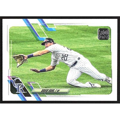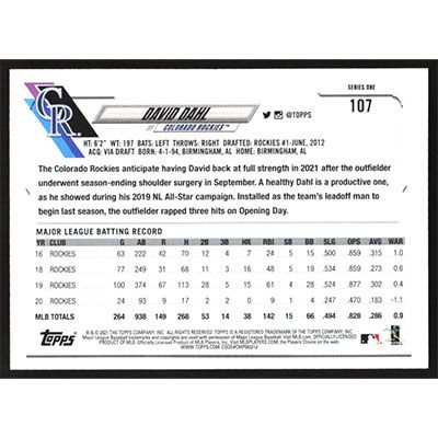 This is a 2021 Topps David Dahl baseball card. The card is #107 and pictures show condition.