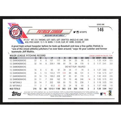 This is a 2021 Topps Patrick Corbin baseball card. The card is #146 and pictures show condition.