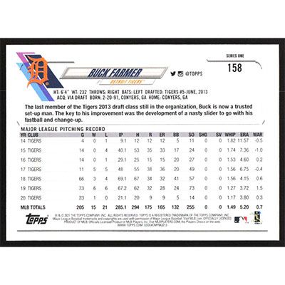 This is a 2021 Topps Buck Farmer baseball card. The card is #158 and pictures show condition.