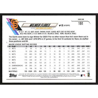 This is a 2021 Topps Wilmer Flores baseball card. The card is #191 and pictures show condition.