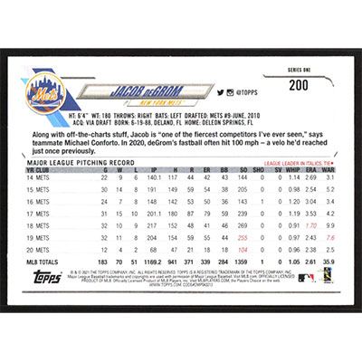 This is a 2021 Topps Jacob deGrom baseball card. The card is #200 and pictures show condition.