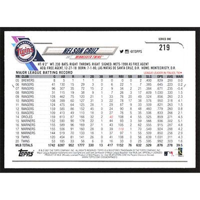 This is a 2021 Topps Nelson Cruz baseball card. The card is #219 and pictures show condition.