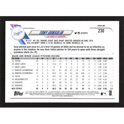 This is a 2021 Topps Tony Gonsolin baseball card. The card is #230 and pictures show condition.